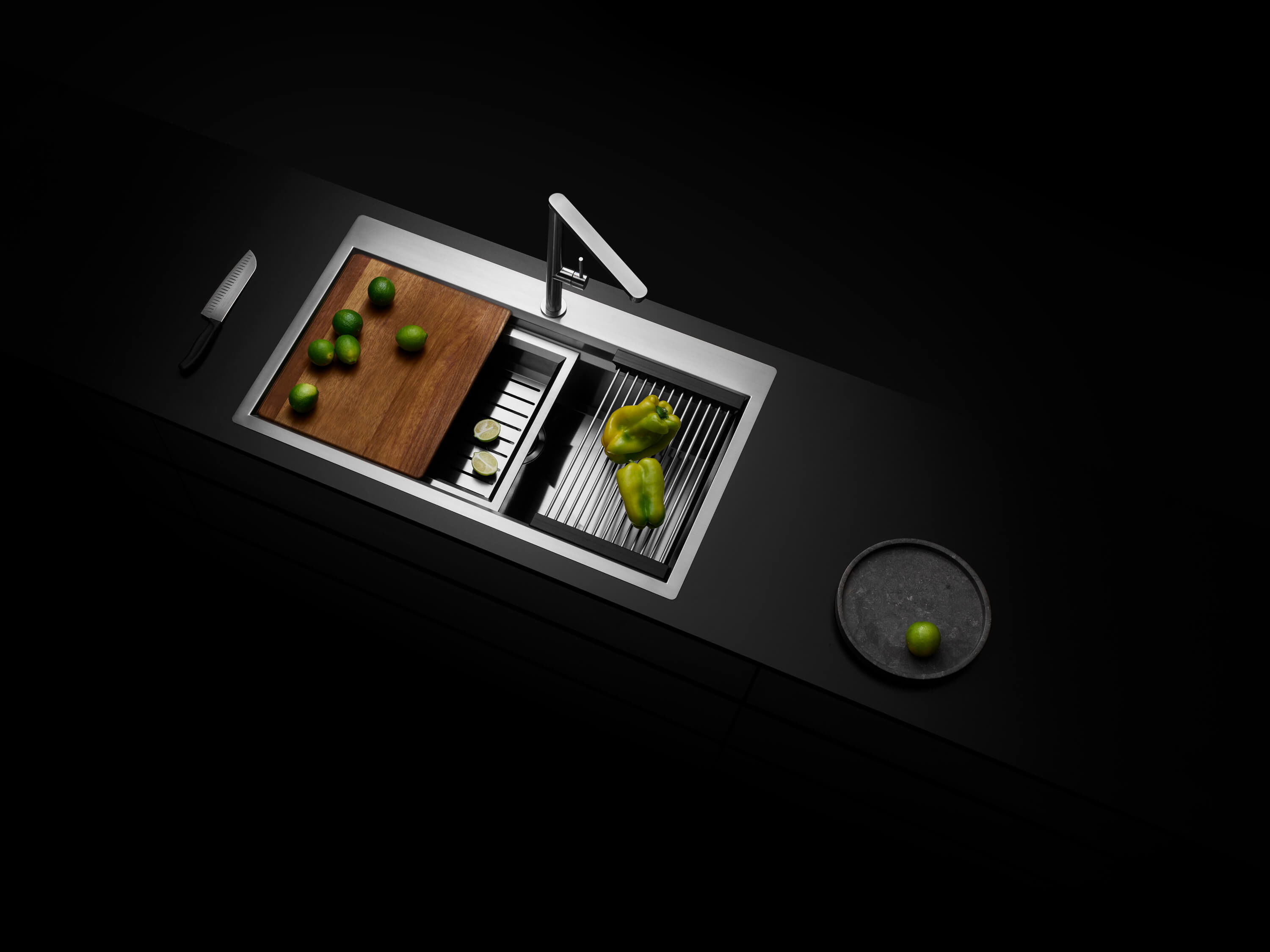 Tasca HARMONY Workstation to zlewozmywaki wielofunkcyjne, zaprojektowane z myślą o zapewnieniu wygody i ergonomii pracy kuchennych. Siłą tej linii jest zapewnienie płynnej pracy akcesoriów na całej powierzchni i ułatwienie w ten sposób wykonywania prac kuchennych.